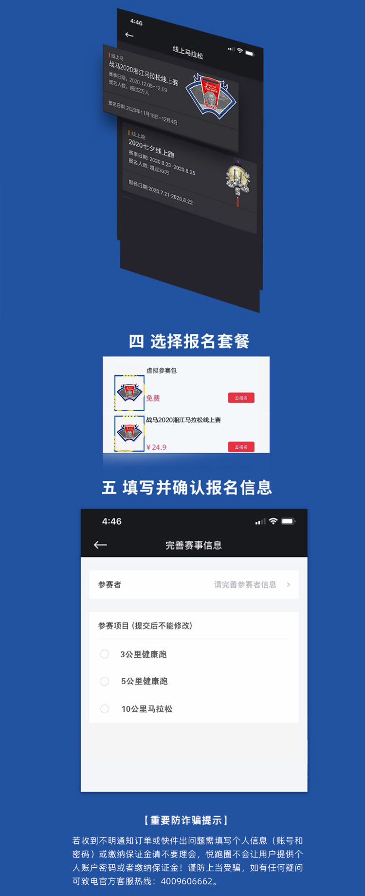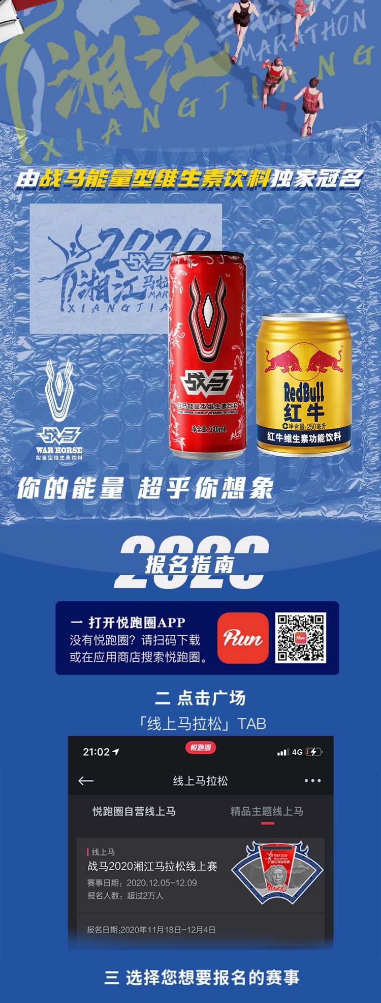? 報(bào)名途徑:選手們需登錄線(xiàn)上跑官方指定跑步類(lèi)APP—“悅跑圈”-點(diǎn)擊「廣場(chǎng)」-「線(xiàn)上馬拉松」入口,選擇戰(zhàn)馬2020湘江馬拉松線(xiàn)上賽