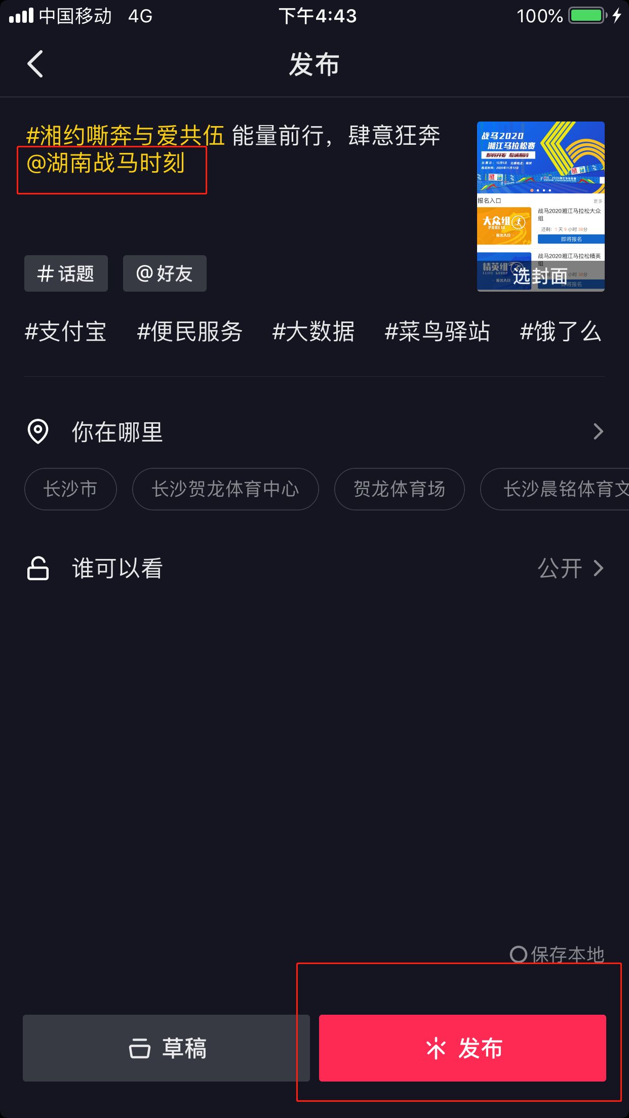 第三步:添加話題#湘約嘶奔與愛共伍,并@湖南戰(zhàn)馬時刻,點擊發(fā)布即可。