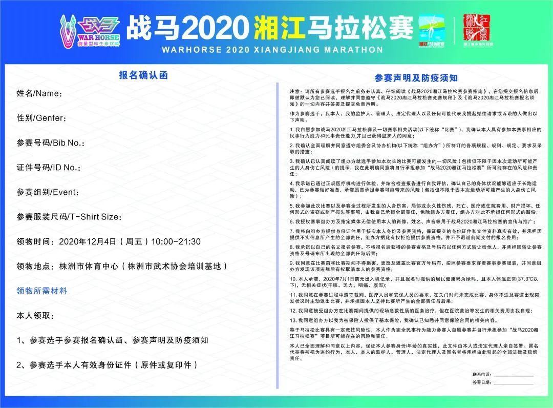 3、參賽者需攜帶本人二代身份證原件/復(fù)印件、到物品發(fā)放處簽署《報名確認函》、《參賽聲明及防疫須知》后,方可領(lǐng)取物資。